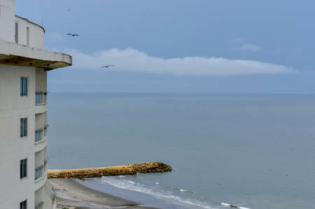 Side view of a new white building with blue windows in the Cartagena, Colombia.