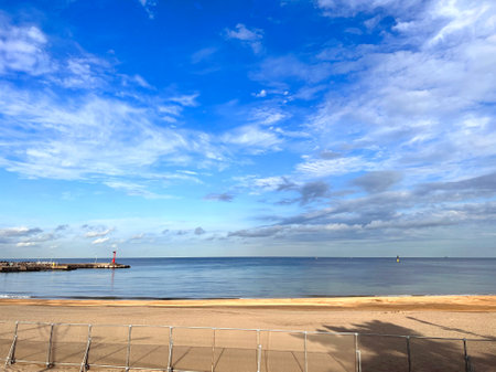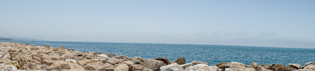 View of the beach and the sea from the promenade in Lisbon, Portugal