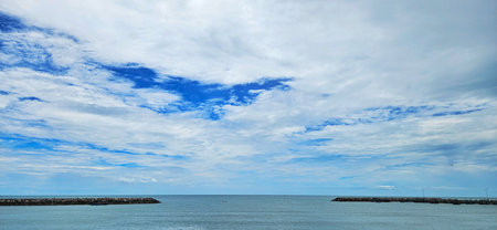 Stone walkway leading to the sea, blue sky and white clouds
