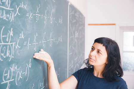 Woman teacher writes formula on the blackboard with chalk, learning, numbers