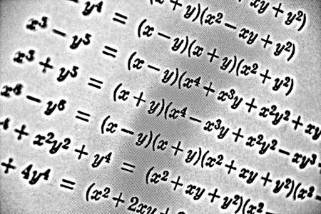 Close up of an old textbook with algebra formulas. Background of numbers and letters.
