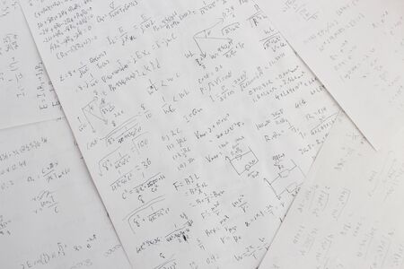 Sheets of paper with different mathematical formulas, closeup