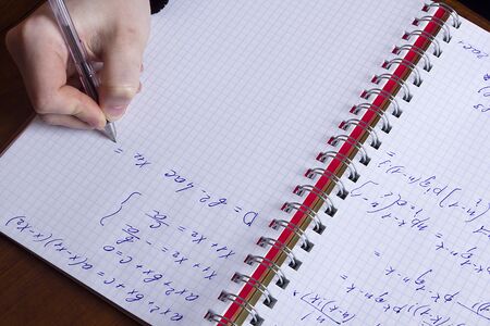 mathematical formulas are written in a notebook. solution school examples in algebra and geometry