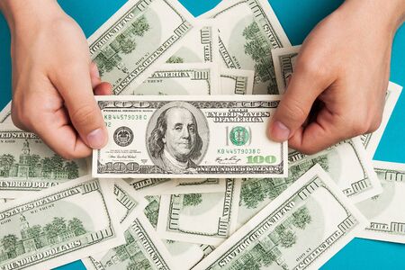 Top view of female hands counting money on dollar background. Debt concept. Investment concept.