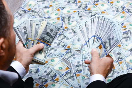 Mans hands holding dollars on dollars background, closeup