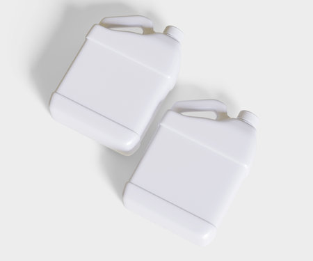 Plastic chemical gallon containers with green cap in two sizes, isolated on white background with some cast shadow, room for copyspace text