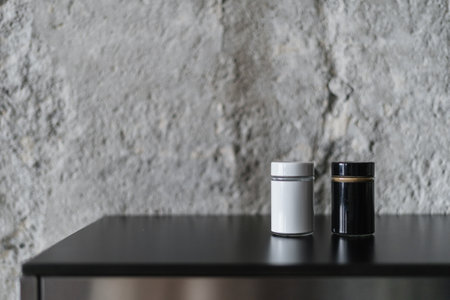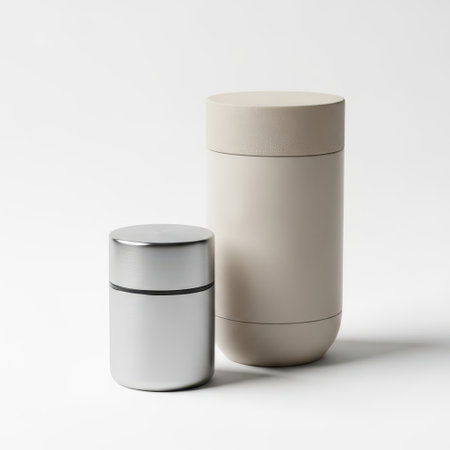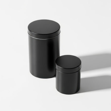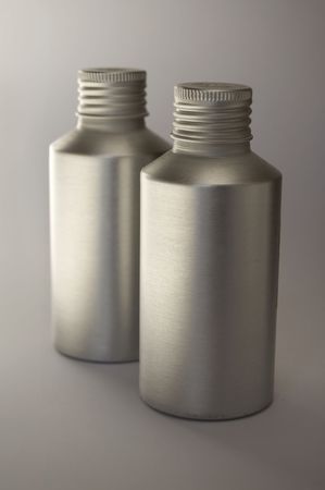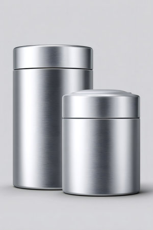 Two closed brushed metal jars are displayed on a gray background, creating a sleek and modern aesthetic