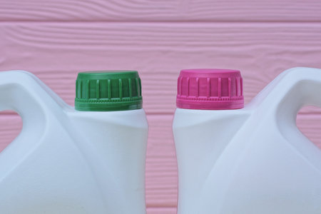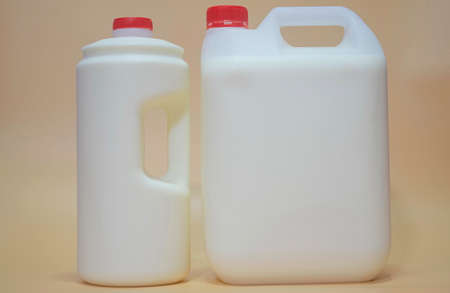 pair of plastic gallons of different configuration on wooden background