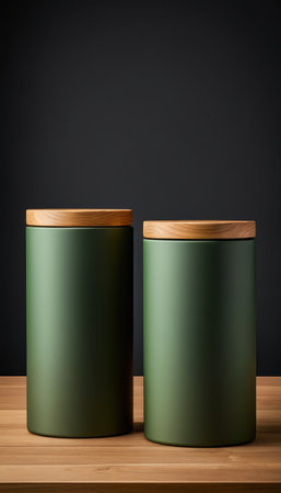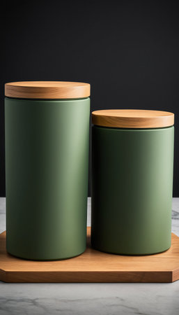 Green and wooden kitchen canisters on wooden surface.
