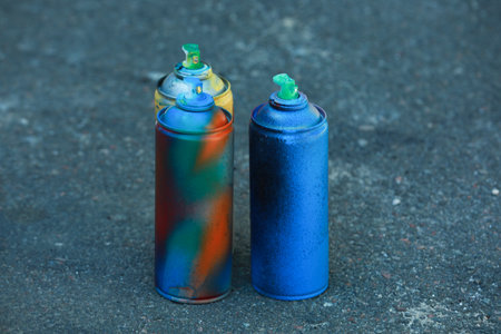 Many spray paint cans on ground outdoors