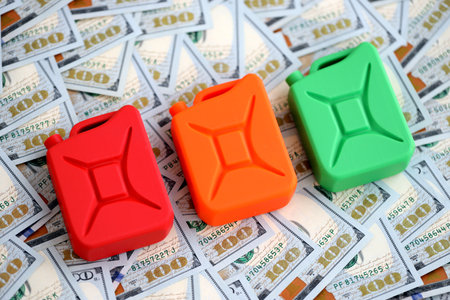 Gasoline canister lies on big amount of dollar bills. Concept of petrol prices in United States