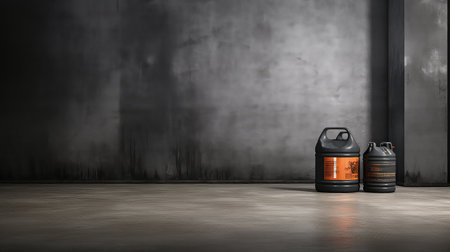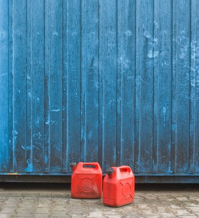 Plastic jerrycans near brick wall