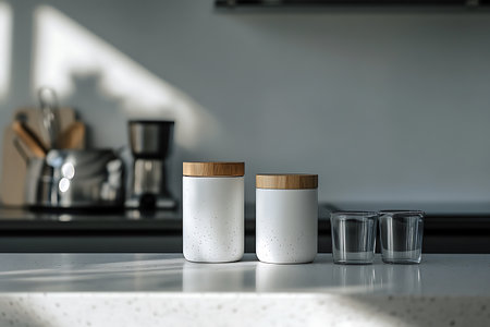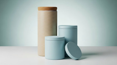 Title: showing title: four minimalist cylindrical storage containers in beige and light blue on neutral background. resolution use.