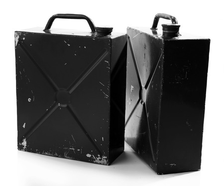 Two old and rusty military gasoline canisters isolated on white background