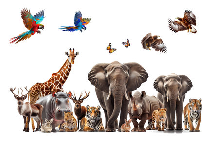 Various majestic African animals stand proudly against a white background, showcasing the lion, elephant, giraffe, zebra, and more in high detail and resolution.