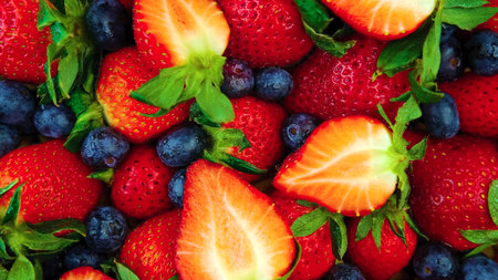 Top view of fresh ripe strawberries and blueberries beautifully arranged in a circular design on a textured gray background. Promoting organic food, health and natural nutrition