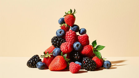 A close-up shot of a variety of fresh berries, including raspberries, blackberries, and blueberries, against a dark background. The image captures the vibrant colors, textures, and freshness of these summer fruits.