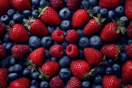 Berries top view closeup colorful assortment of strawberries, blueberries, raspberries, blackberries, red currants on a dark background AI generated image