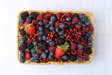 Different ripe berries and mint leaves in wicker basket on white tiled table, top view