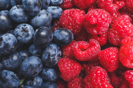 Close-up various fresh summer berries background - Raspberry, Blueberry and Red currant