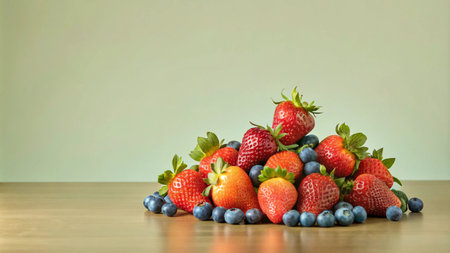 Bowl of blueberries and strawberries on a wooden table. Top view.