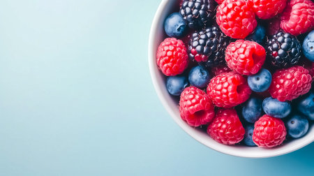 panoramic close-up of raspberries and blueberries on wooden background. top view and copy space for text