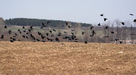 rooks flock flying through the sky,black birds, opened wing silhouettes