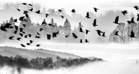 A large flock of black birds, silhouetted against a gloomy, overcast, or foggy gray sky. The birds, likely crows or ravens, are flying in various directions, creating a chaotic, eerie, and ominous mood.