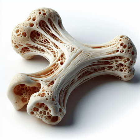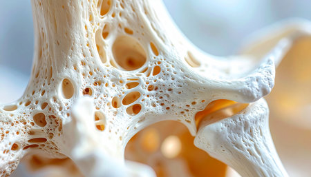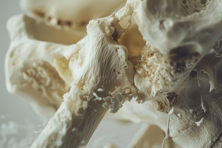Photo showing close up of porous bone structure with medical lighting and shallow depth of field keywords:...