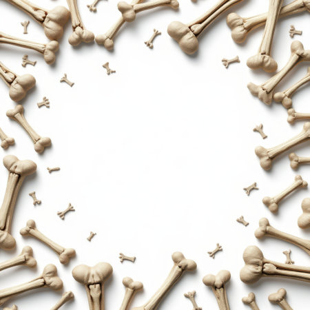 A collection of white dog bones arranged on a soft background, perfect for pet food advertising or playful kitchen decor. Ideal for animal lovers.