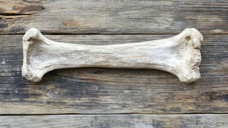 A single fragmented bone displayed on a rustic wooden surface, showcasing natural textures and earthy tones. This image evokes a sense of history and simplicity.