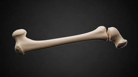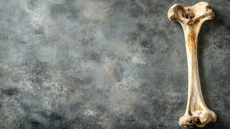 The image features a broken femur bone placed on a smooth gray surface, highlighting its anatomical structure and texture, perfect for medical and educational use.