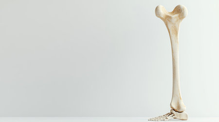 A detailed view of a human femur bone displayed against a simple background. Ideal for medical, educational, and anatomical projects focused on the human skeleton.