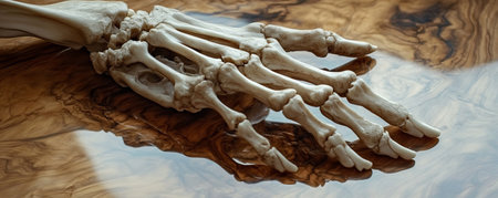 Human hand skeleton on wooden surface with reflections, anatomical study concept