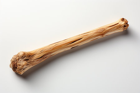 A single bone fragment placed diagonally on a textured white surface, showcasing its natural shape and detail in a clean, minimalistic style.