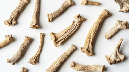 Top-down view of several dried ginseng roots scattered on a white background. The plain backdrop highlights the earthy tones and unique shapes.