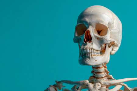 An anatomically precise human skeleton focusing on the skull and upper limb bones, set against a smooth teal background?ideal for learning and medical showcases.