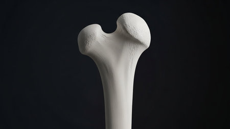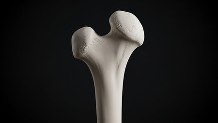 Detailed view of a human femur bone against a dark background, highlighting its structure and anatomy.
