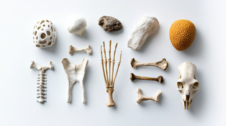 A collection of bones and other objects, including a skull, are arranged in a pattern on a white background. Concept of curiosity and fascination with the natural world