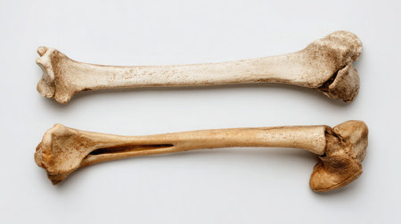 This image displays crossed femur bones arranged elegantly on a smooth white background. Ideal for medical illustrations, educational content, and anatomical studies.