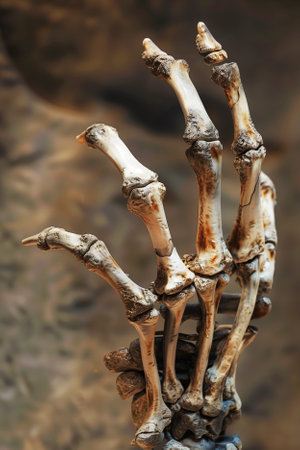 A close-up representation of a human hand skeleton highlights the intricacies of the phalanges and metacarpals