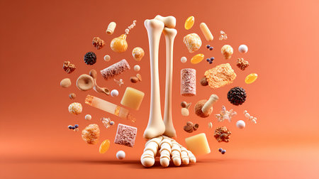 3d illustration of human skeleton and various food on orange background.