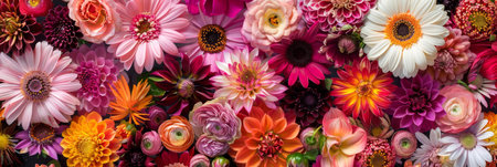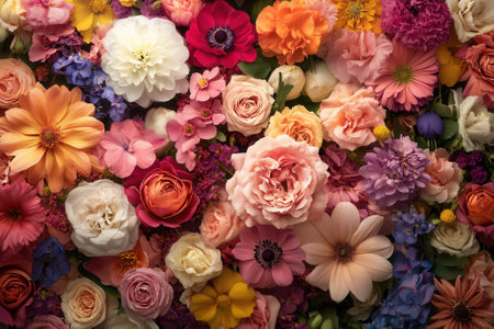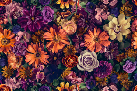 A vibrant texture of various blooming flowers presenting a beautiful and colorful floral assortment