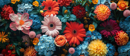 A vivid assortment of various flowers including roses, chrysanthemums, daisies, and hydrangeas creating a beautiful, colorful floral pattern. ideal for botanical art prints, greeting cards, and posters, this arrangement embodies the essence of nature s beauty. Generative AI