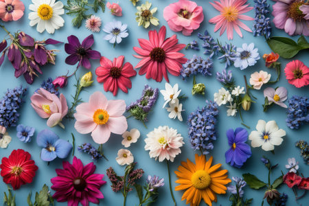 A vibrant mix of colorful flowers in a flat lay.