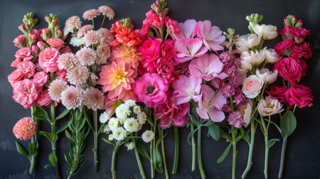 A vibrant mix of colorful flowers, including roses, daisies, dahlias, and peonies, arranged in a flat lay pattern on a dark background.