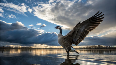 A Canada Goose shakes out its feathers after a bath and fluffs out itself in the soft sunlight with a smooth background.