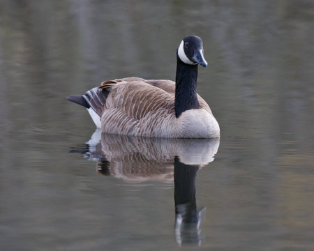 A single Canada Goose floating on the calm water of a pond showing a reflection