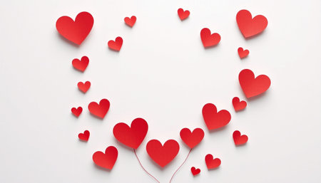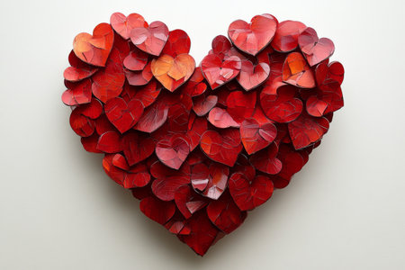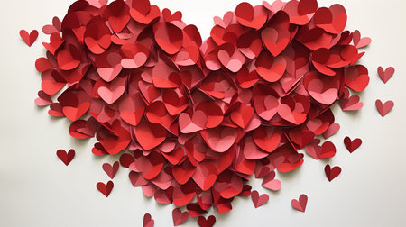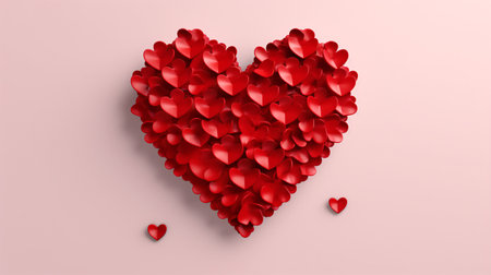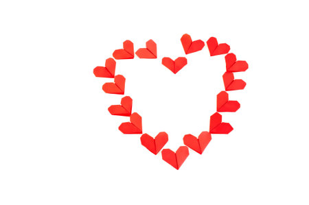 red heart, lined with small paper hearts, made of origami-style, on a white background