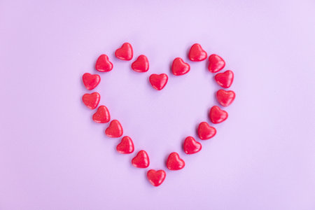 Colored sweet candy heart shape on a red background. Top view.